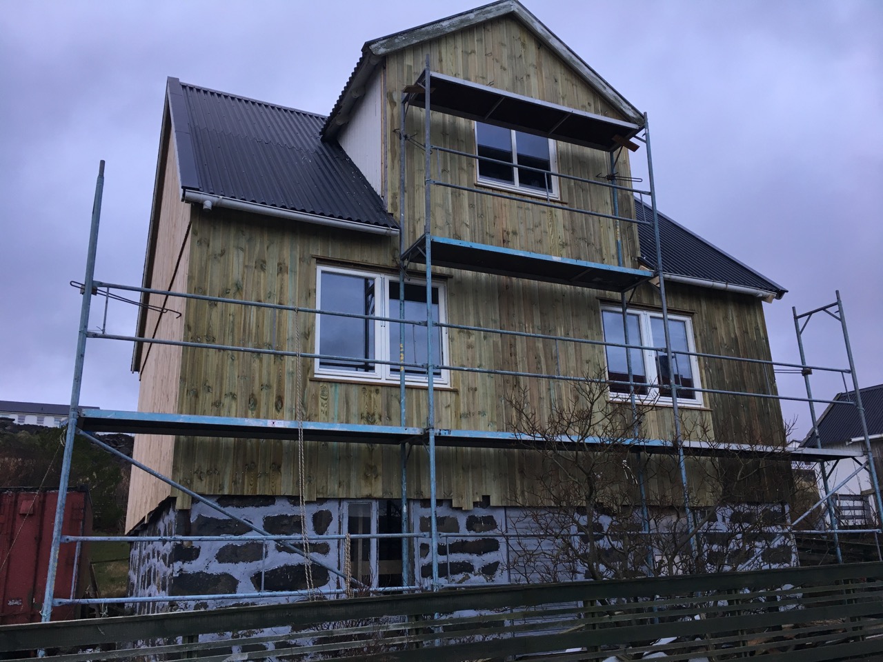 Kundin var byrjaður, at klæða húsini sjálvur, men fann síðan útav, at sillin var rotin og illa farin. Hetta er eitt stórt arbeiði, at gera einsamallur. Sum myndirnar vísa, mátti øll niðara síða av húsinum setast undir stúltur meðan sillin var skift út. Eisini klæddu vit síðuna og skiftu vindeygu út.